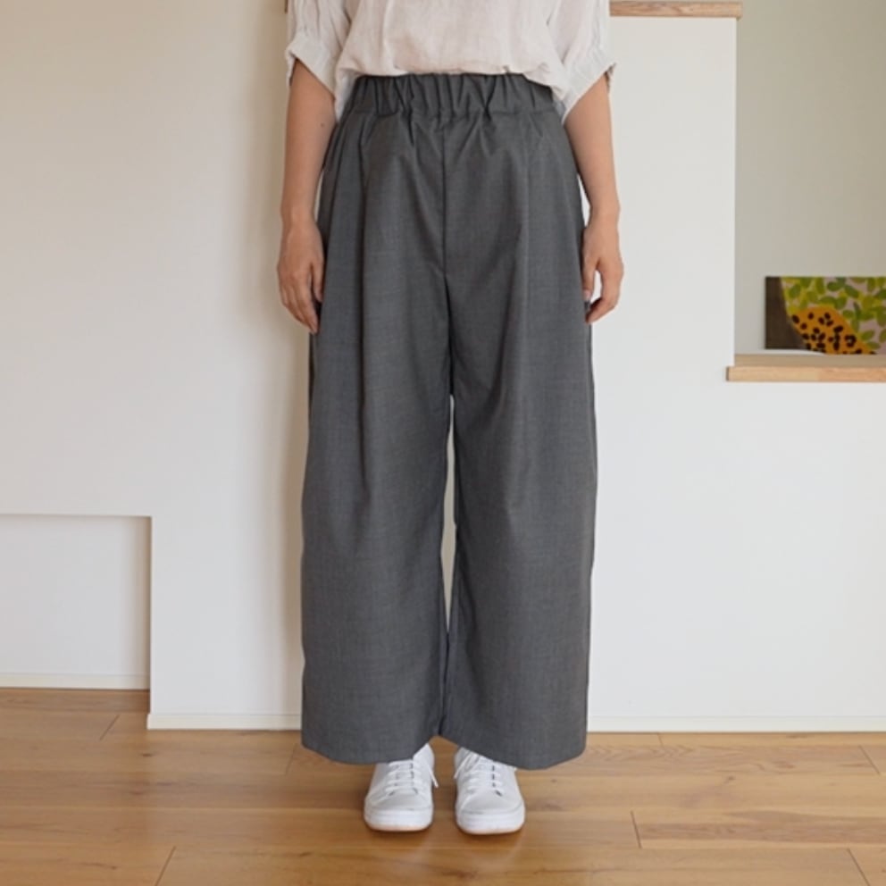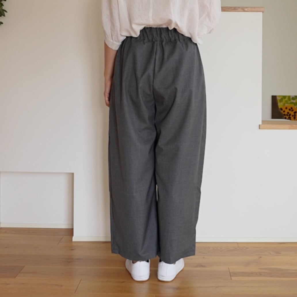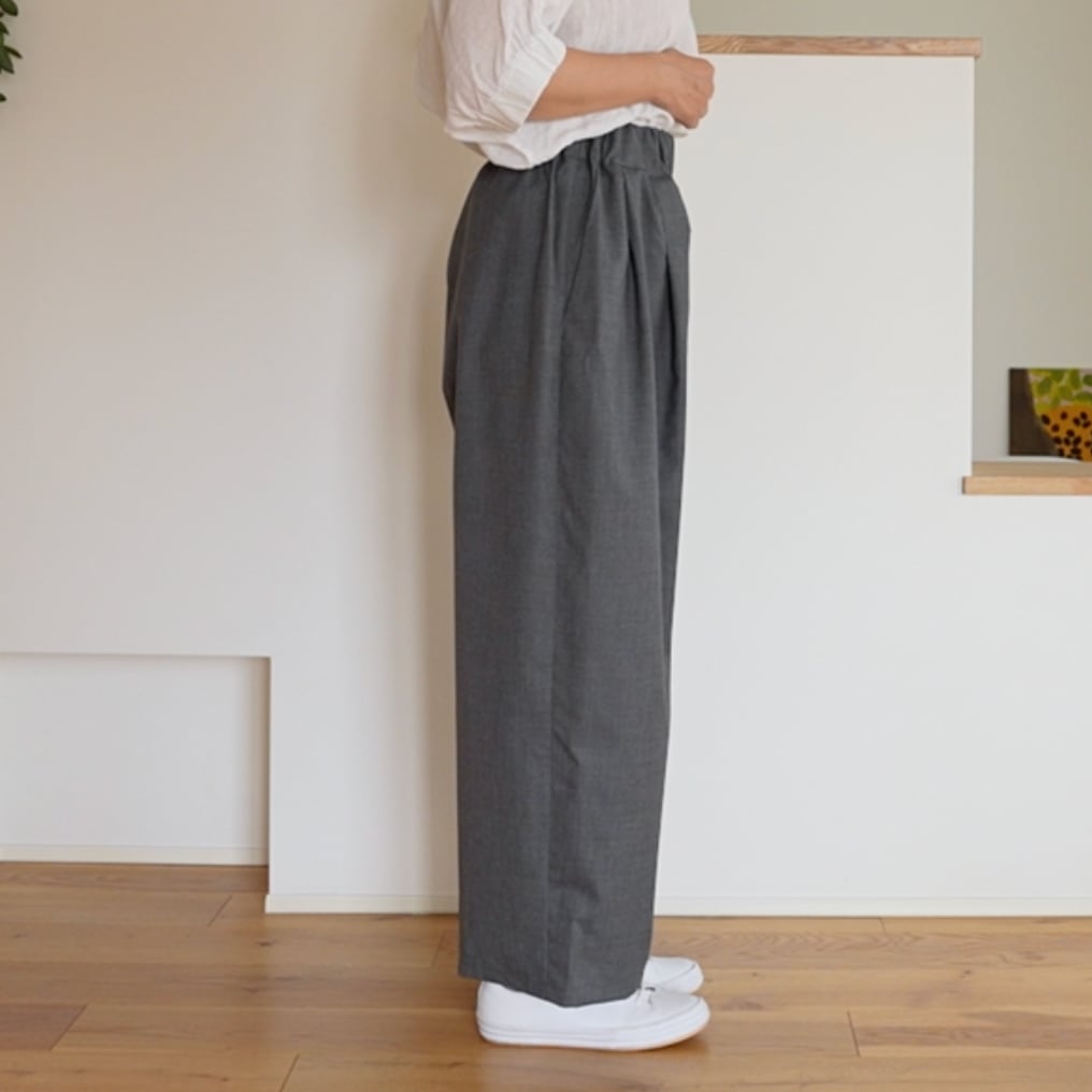 ウエストゴムの楽チン仕様ながら、前に2本のタックを入れてシュッとした雰囲気に。