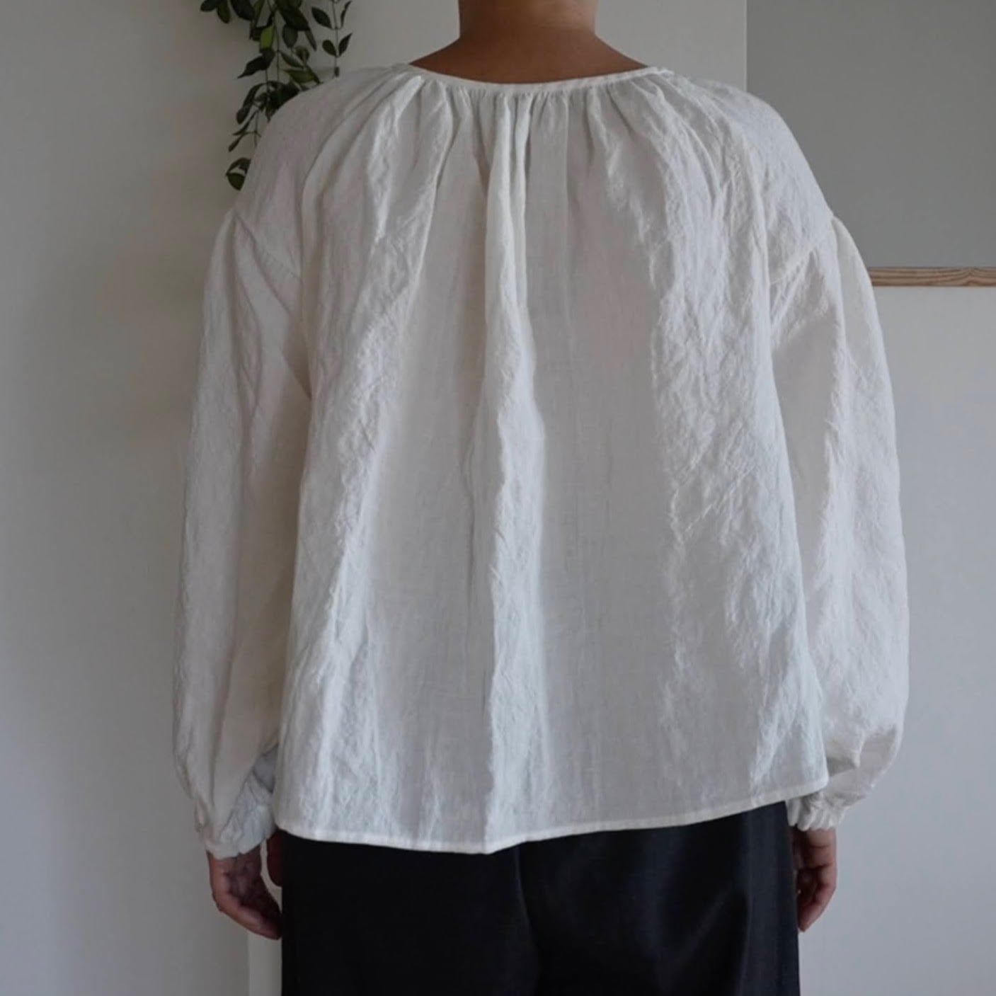 襟元にたっぷりとギャザーを寄せた、ふんわりとしたシルエットのトップスです。
